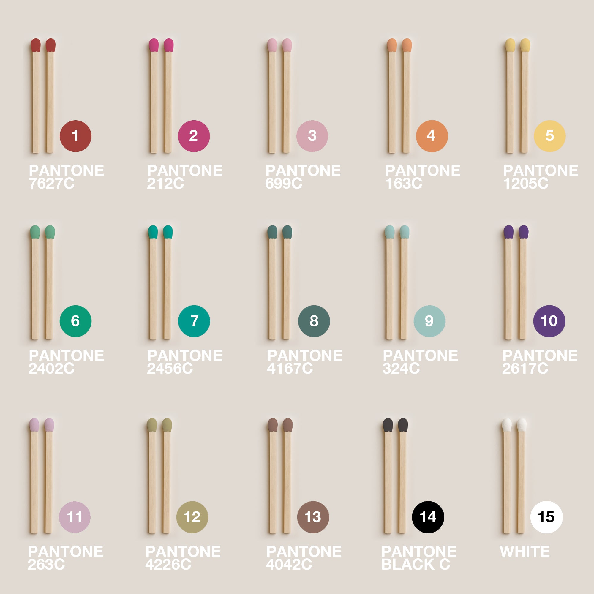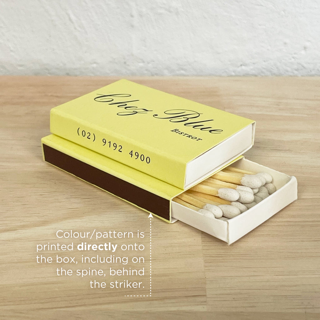 Bulk matchbox orders also get to choose from 15 matchstick tip colours - to further customise your matchboxes as a whole! We can cater custom matchstick tip colours, but this will incur an additional cost.
