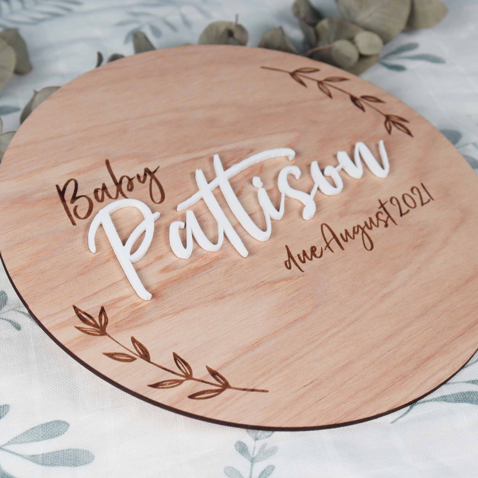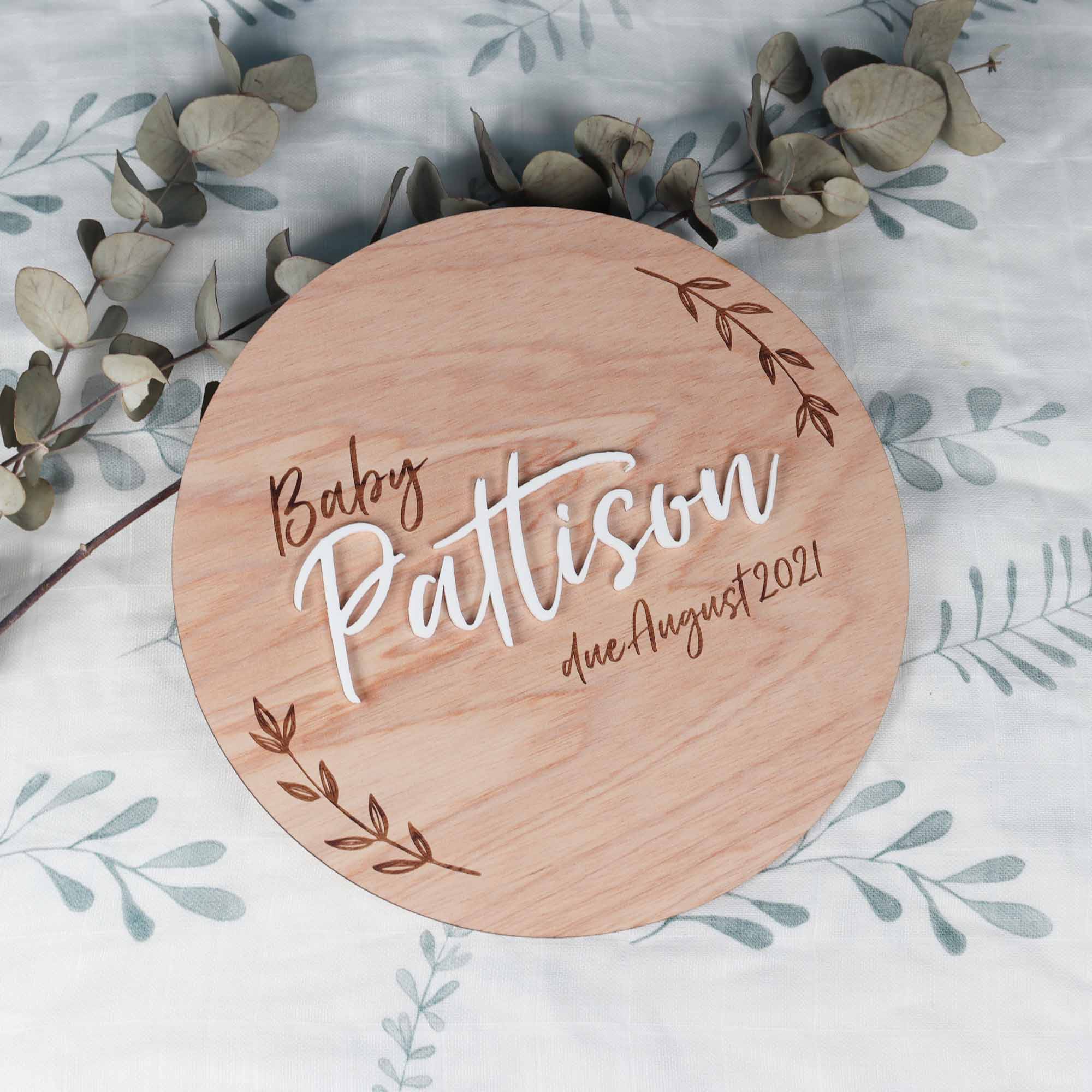 How to order: Leave us a note with the EXACT WORDING. This pricing comes with one name in 3D white wording I.e 'Hunter'. The rest of the design wording etched in the wood. Standard design wording to read: Baby X due MONTH YEAR (let us know the exact detail when you order) - With leaf detail on the outside (leaf detail can be removed on request).
