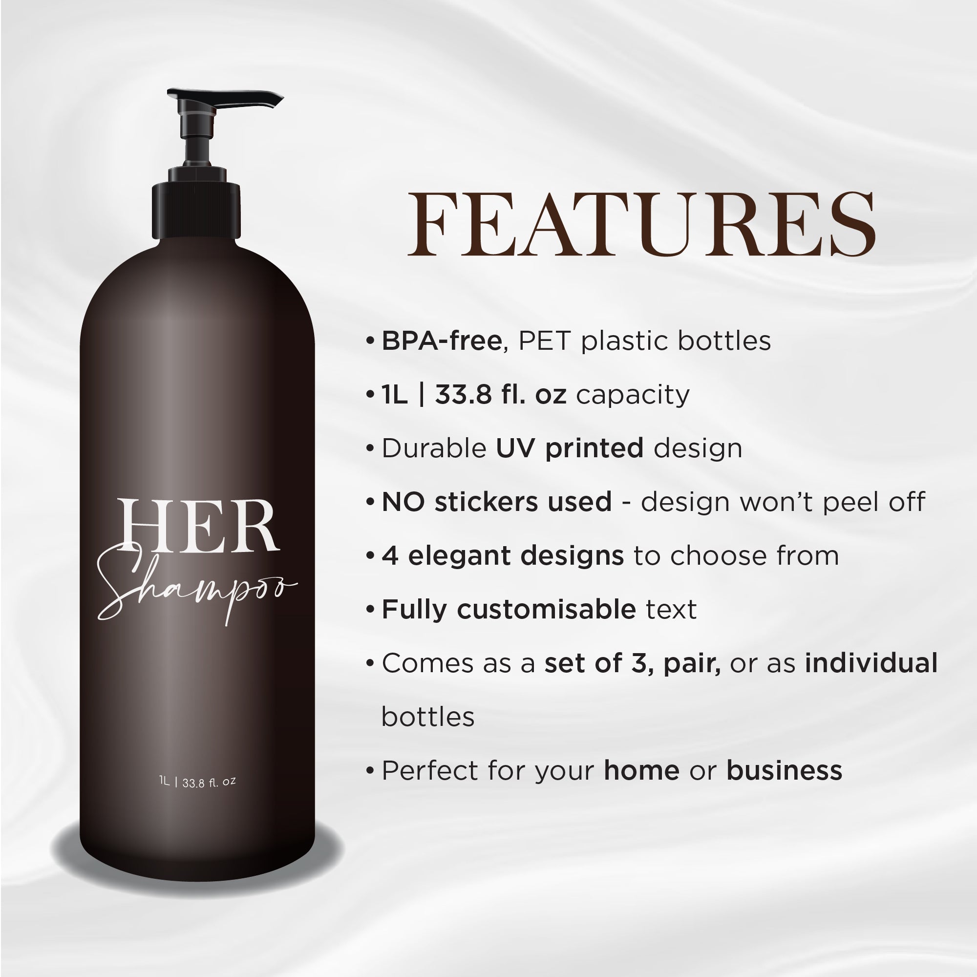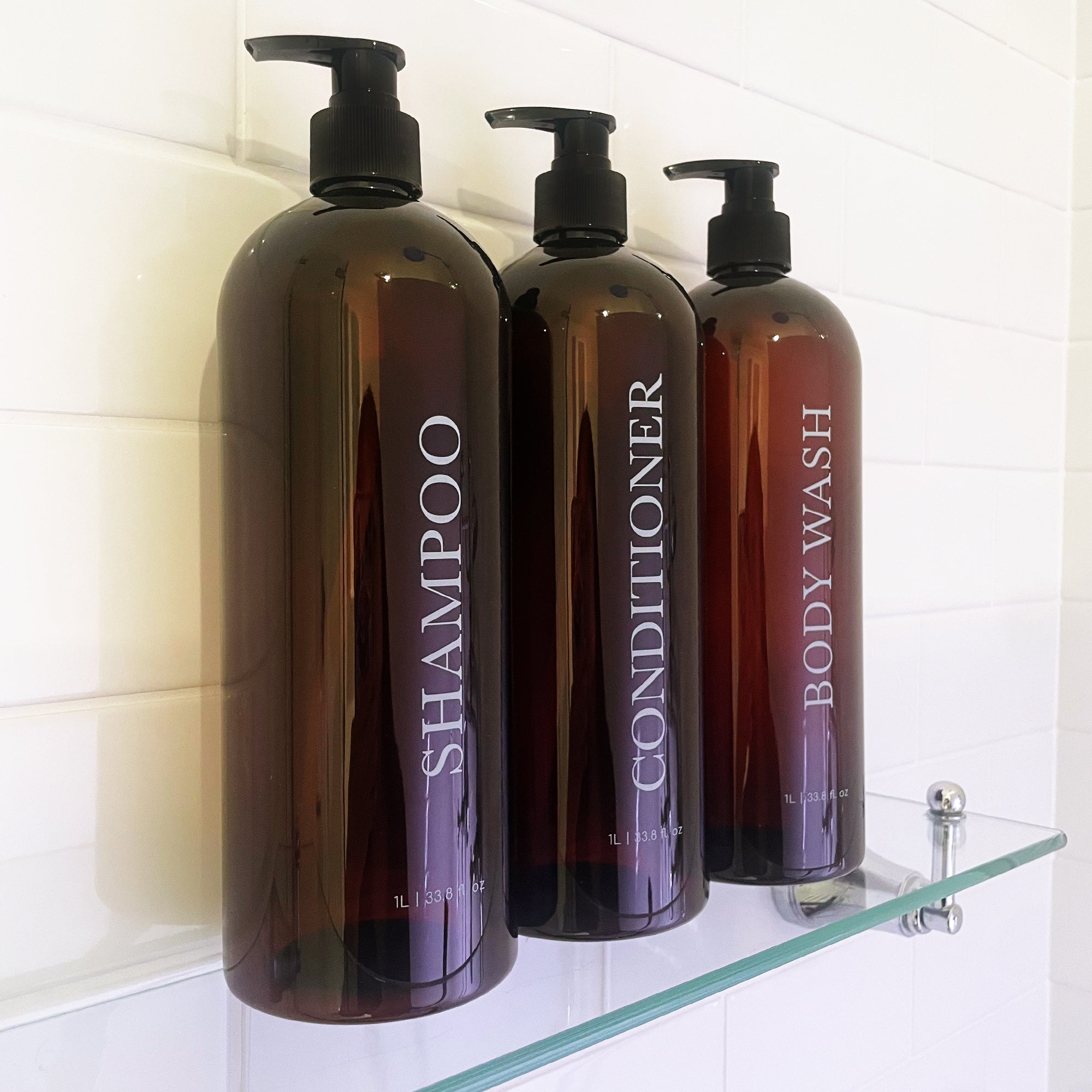 Now available are our new line of elegant, custom-printed 1 Litre Bathroom pump bottles! Our new 1L refillable pump bottles come as a Full Set of Shampoo, Conditioner and Body Wash, a pair of Shampoo and Conditioner, or as single bottles. This pair in Design 2 features a classy, bold, serif font that's perfect for any bathroom and home aesthetic.