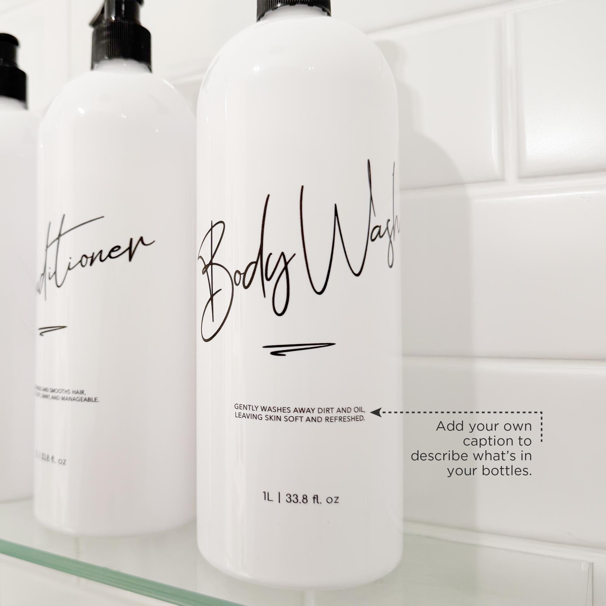 By default, these bottles come with "Shampoo", "Conditioner" and "Body Wash" wording, but you can customise your bottles by selecting the custom option in the drop-down menu. Personalise your bottles to suit your home's needs and to designate bottles to each family member!