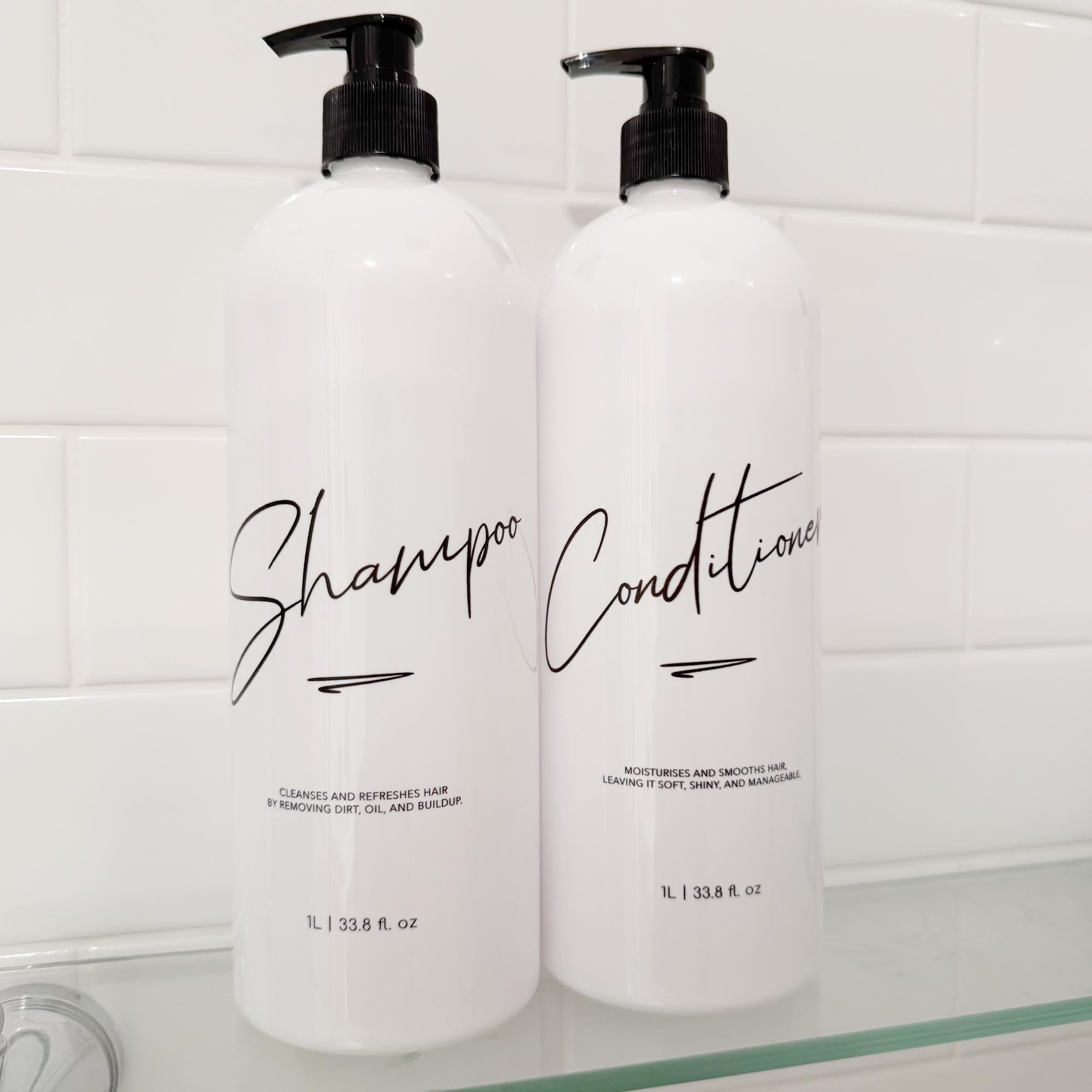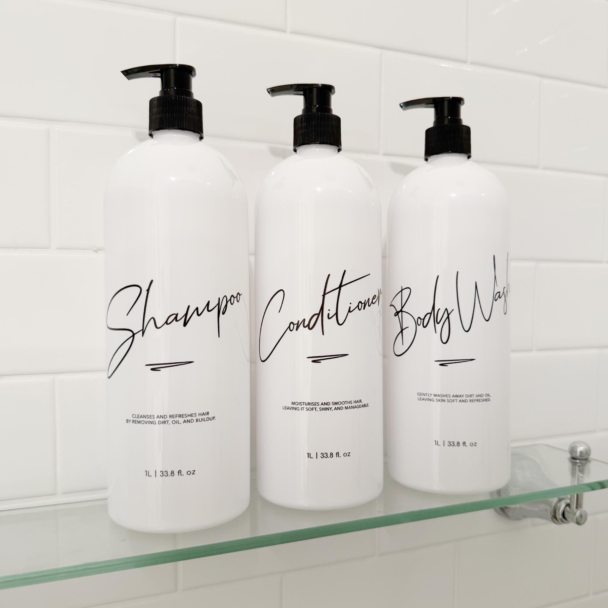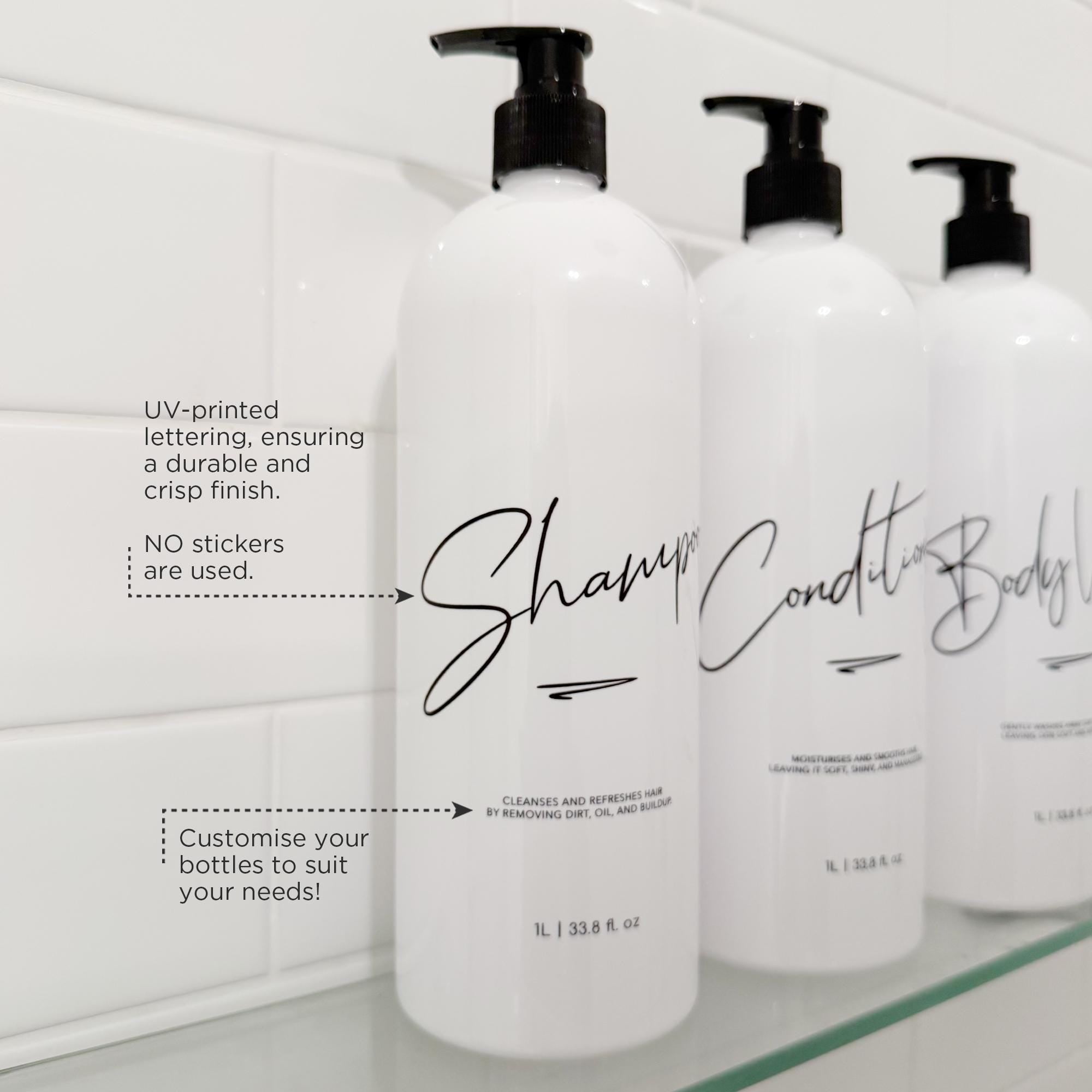 Now available are our new line of elegant, custom-printed 1 Litre Bathroom pump bottles in white! Our new 1L refillable pump bottles come as a Full Set of Shampoo, Conditioner and Body Wash, a pair of Shampoo and Conditioner, or as single bottles. This set in Design 1 features a modern cursive font with small caption that's perfect for any bathroom and home aesthetic.