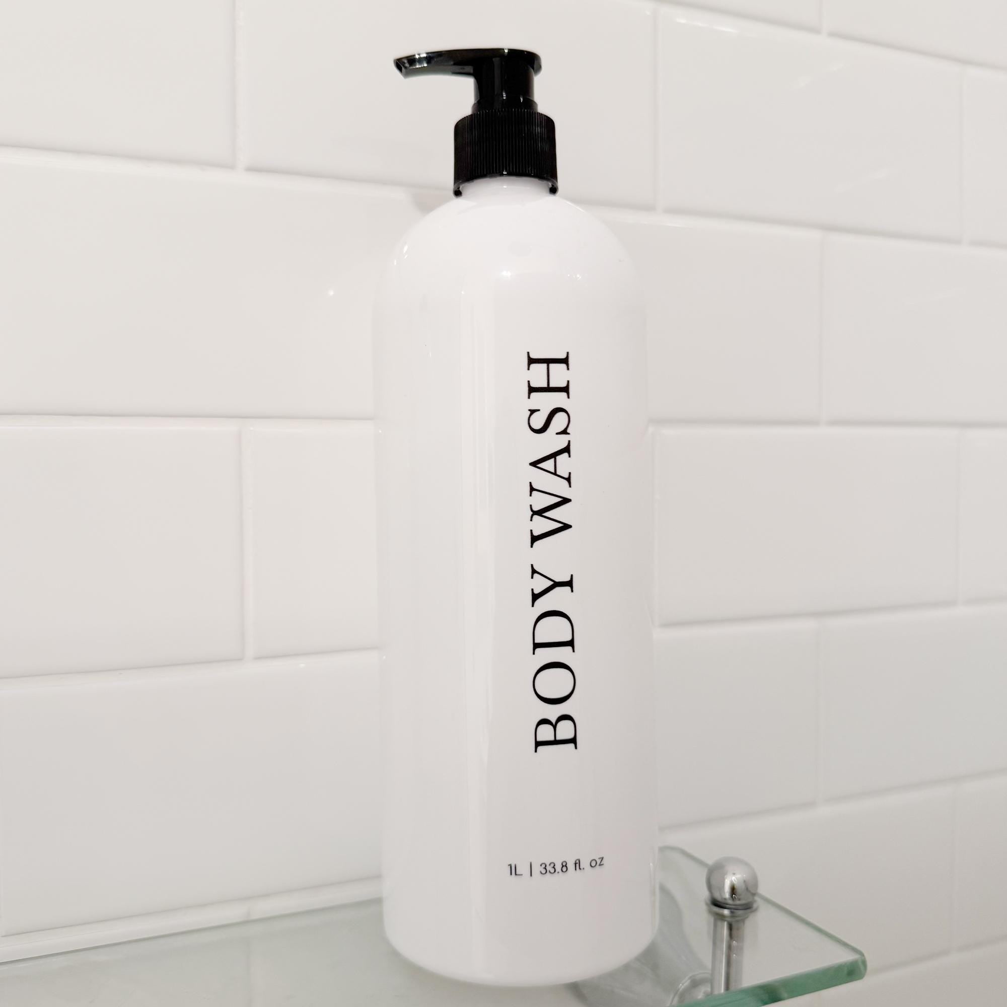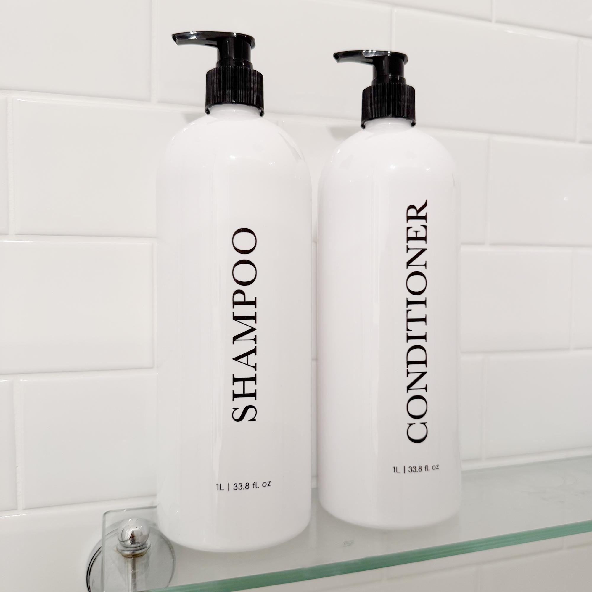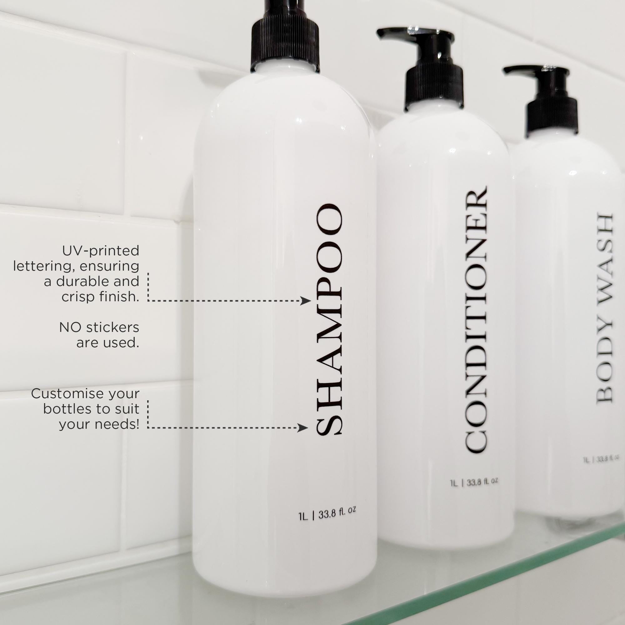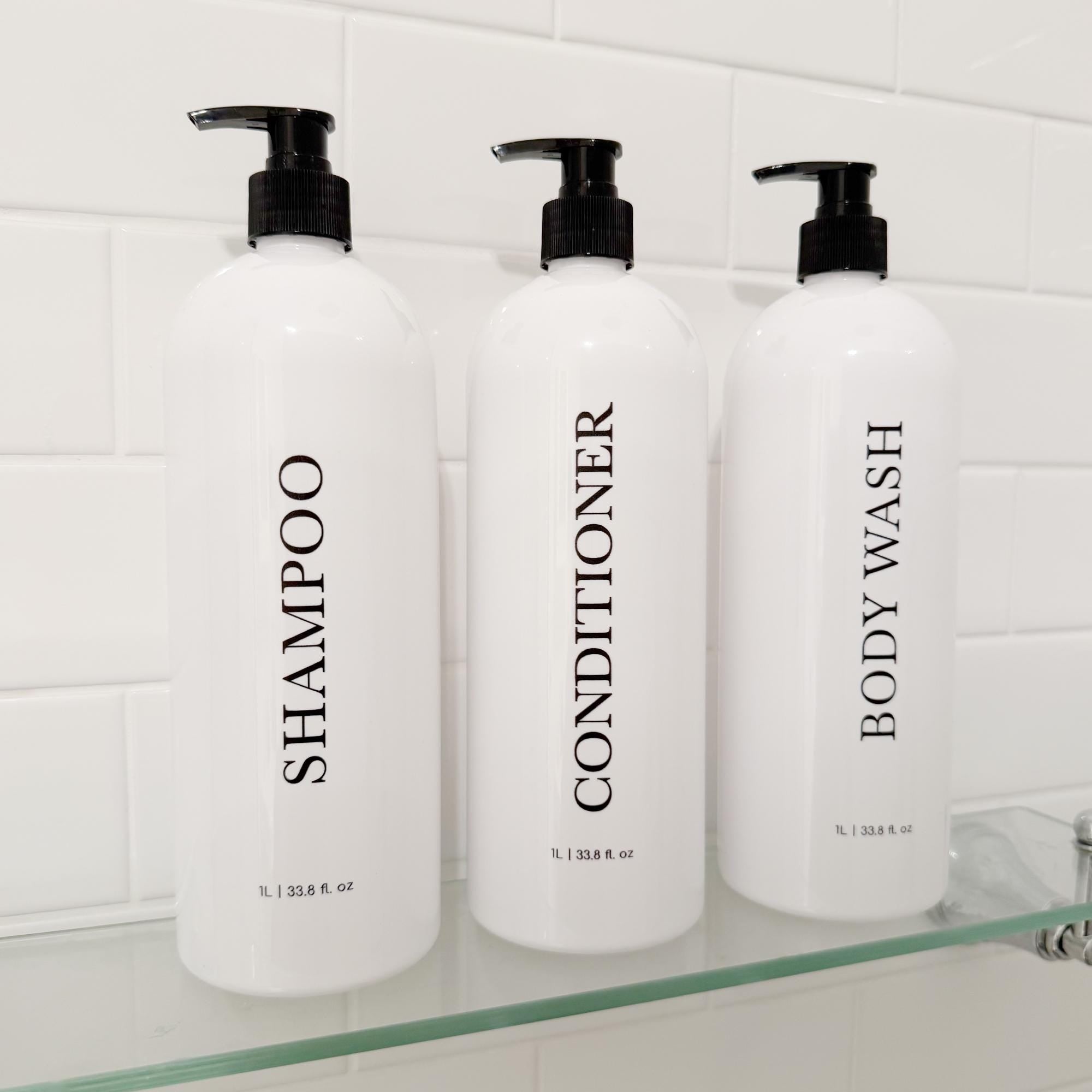 Now available are our new line of elegant, custom-printed 1 Litre Bathroom pump bottles in white! Our new 1L refillable pump bottles come as a Full Set of Shampoo, Conditioner and Body Wash, a pair of Shampoo and Conditioner, or as single bottles. This set in Design 2 features a beautiful and elegant bold font, fit for any aesthetic.