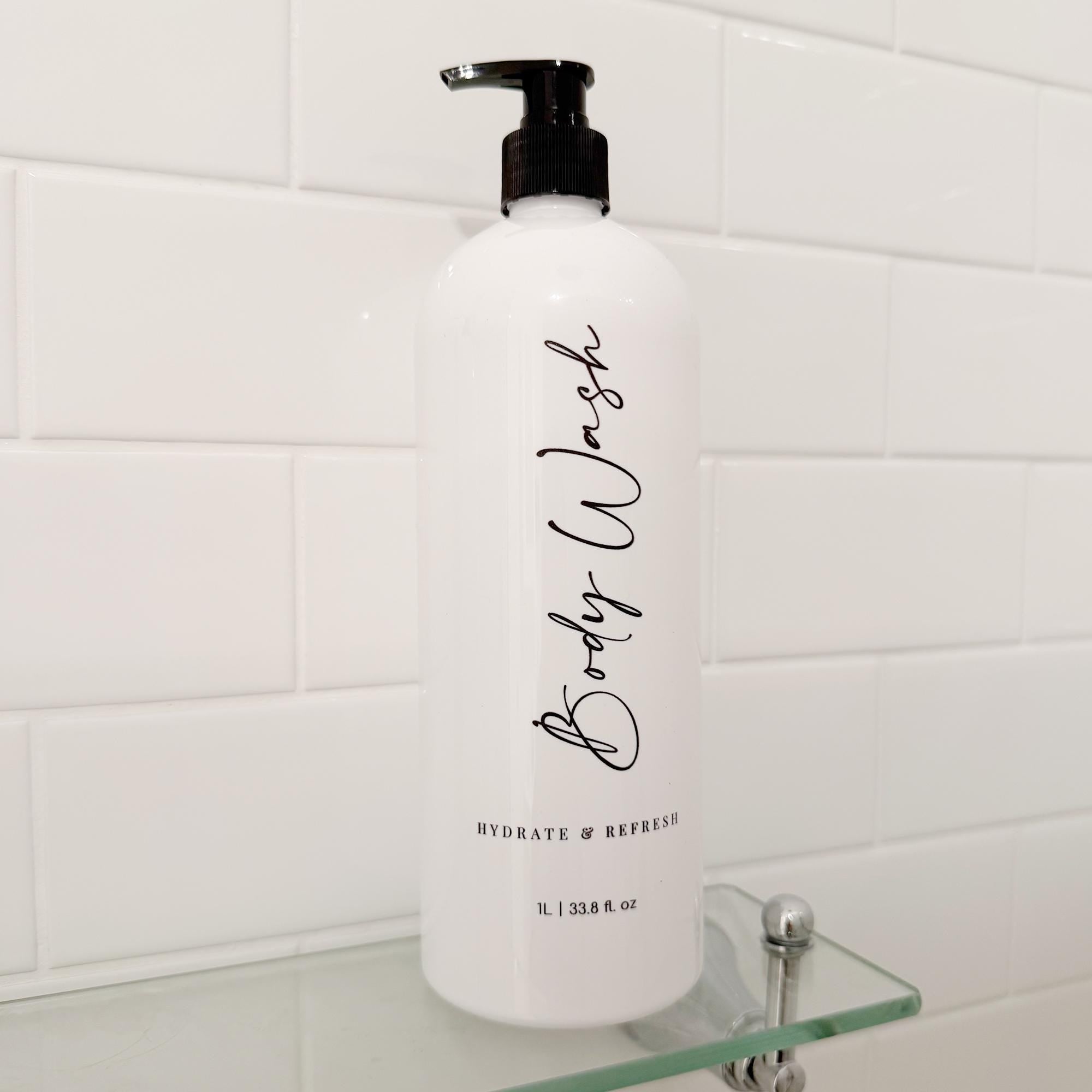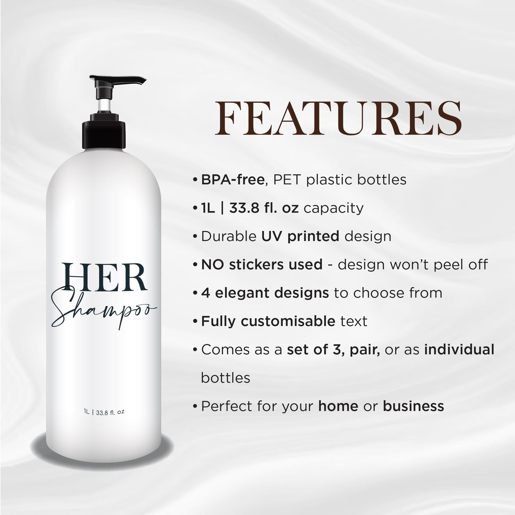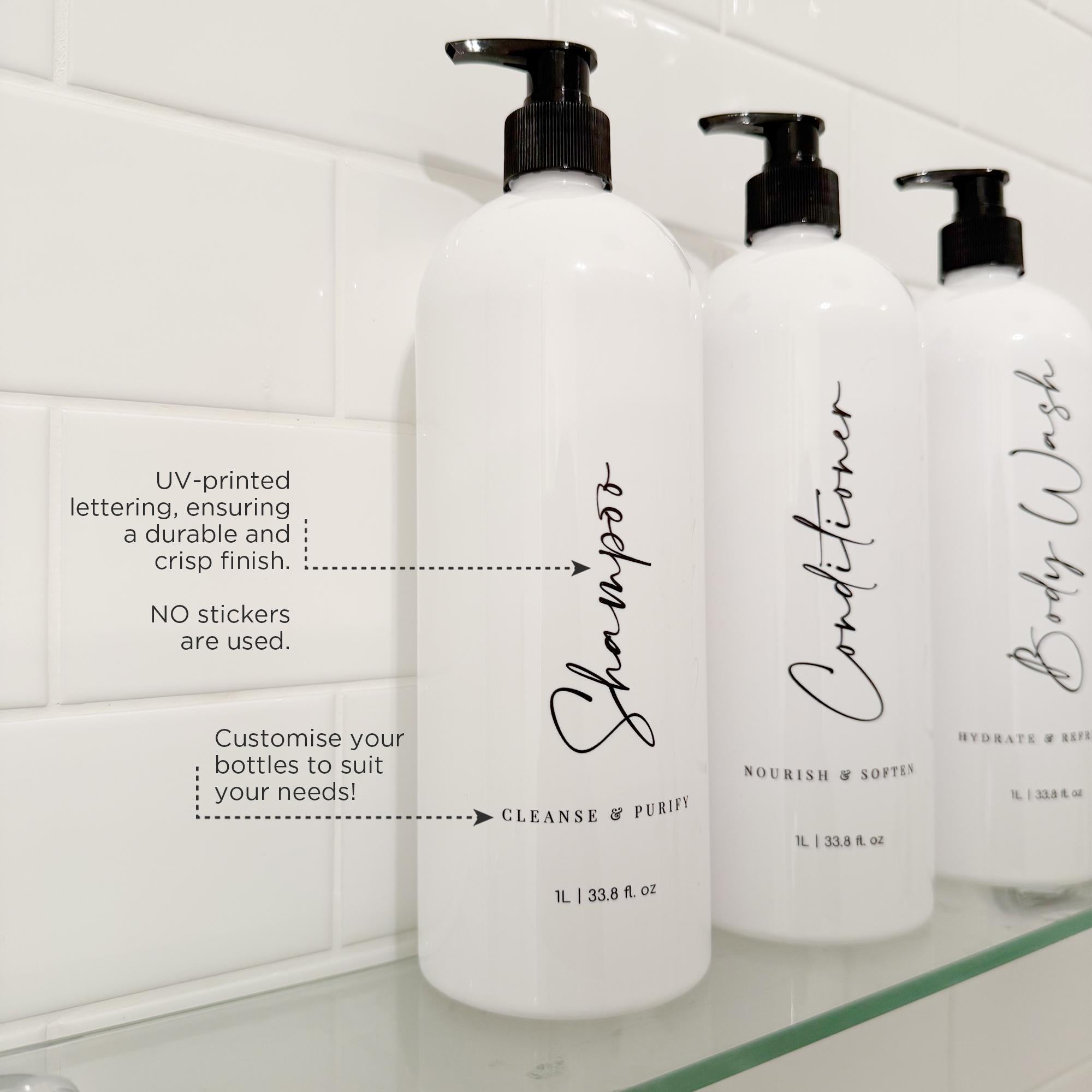 By default, these bottles come with "Shampoo", "Conditioner" and "Body Wash" wording, but you can customise your bottles by selecting the custom option in the drop-down menu. Personalise your bottles to suit your home's needs and to designate bottles to each family member!