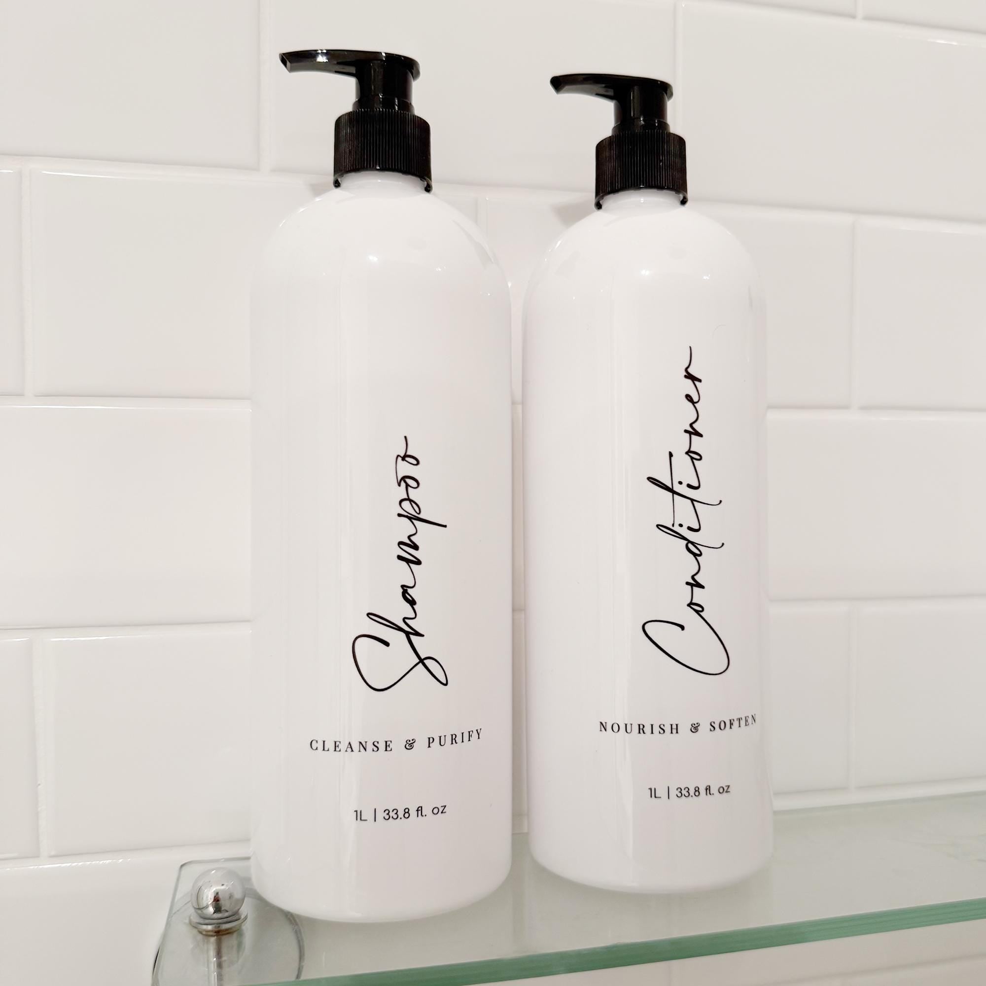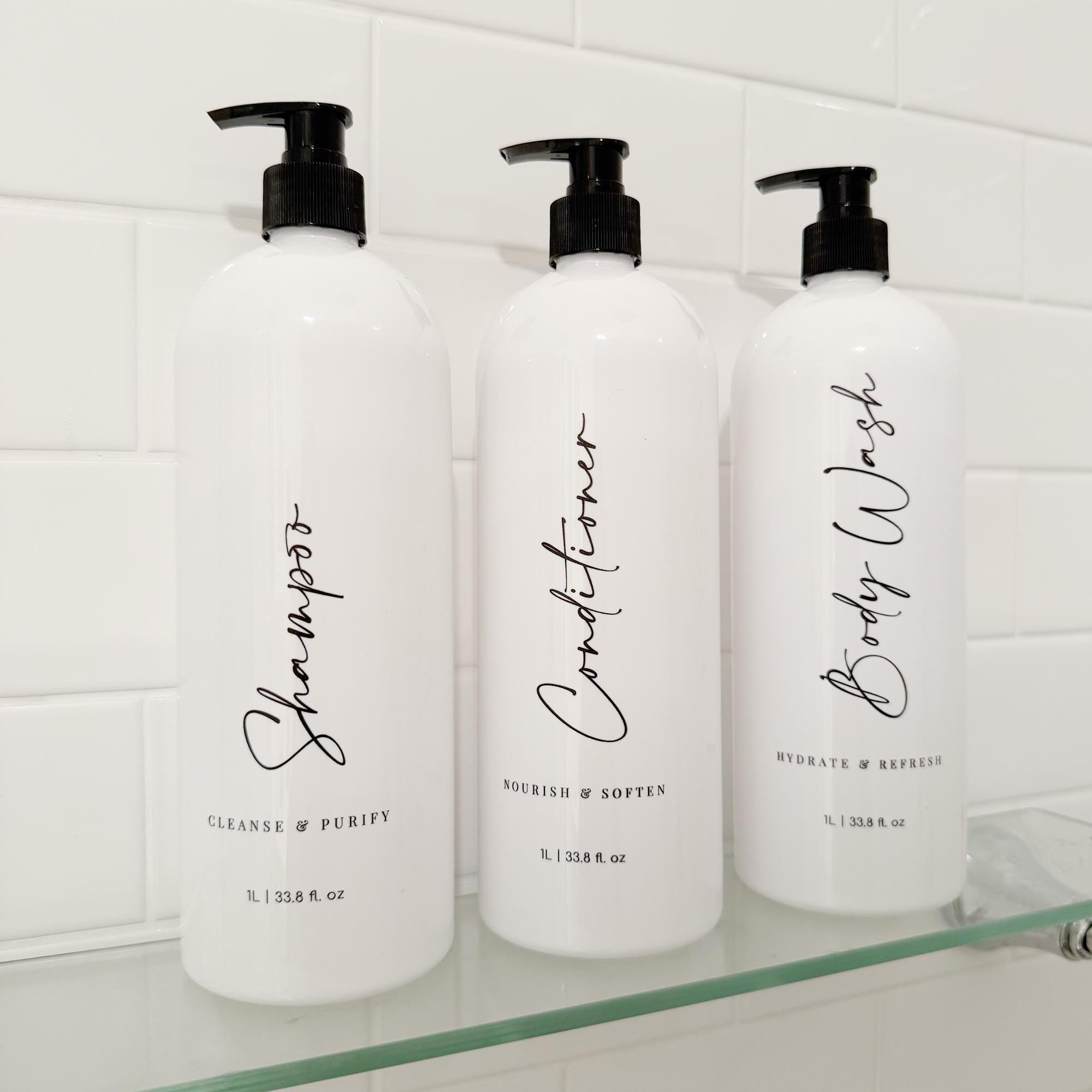 Now available are our popular elegant, custom-printed 1 Litre Bathroom pump bottles, now in white! Our new 1L refillable pump bottles come as a Full Set of Shampoo, Conditioner and Body Wash, a pair of Shampoo and Conditioner, or as single bottles. This set in Design 3 features a mix of fonts with a short caption that's perfect for any bathroom and home aesthetic.