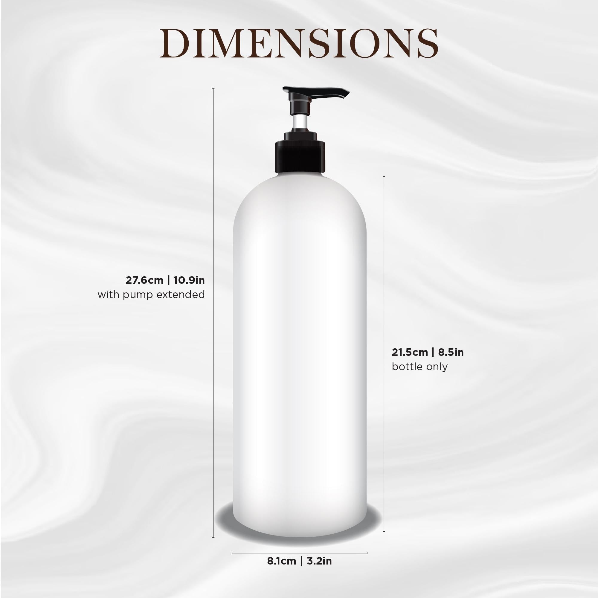 Our beautiful white pump bottles are made from BPA-free, PET plastic, and are highly durable. Each bottle comes with a black pump with white tubing (as shown in listing photos). These bottles have a capacity of 1L or 33.8 fl. oz.