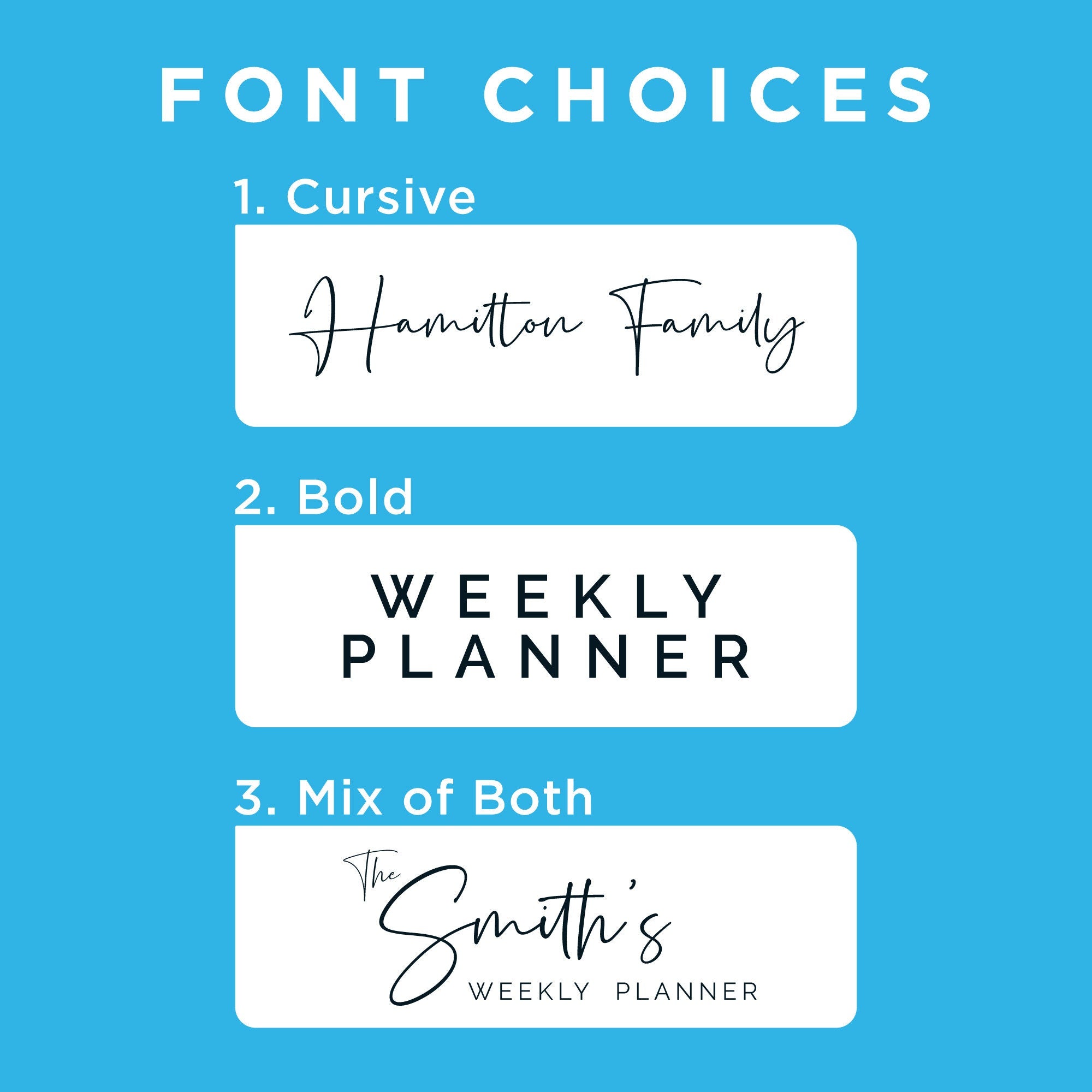 Personalise your planner with a custom title and family names. We allow between 3 to 6 names (columns) for your planner. The 'Notes' section title can also be customised to your liking.