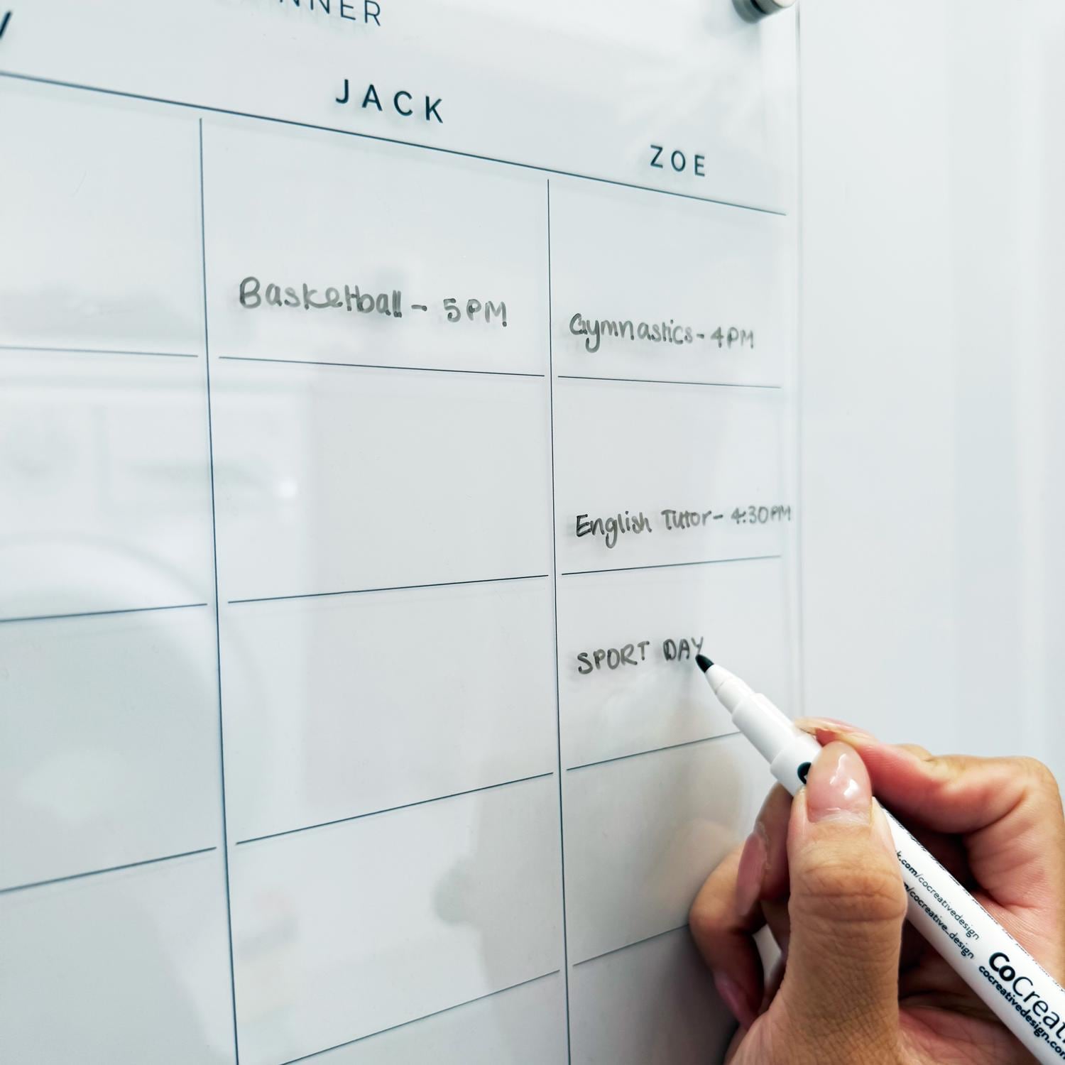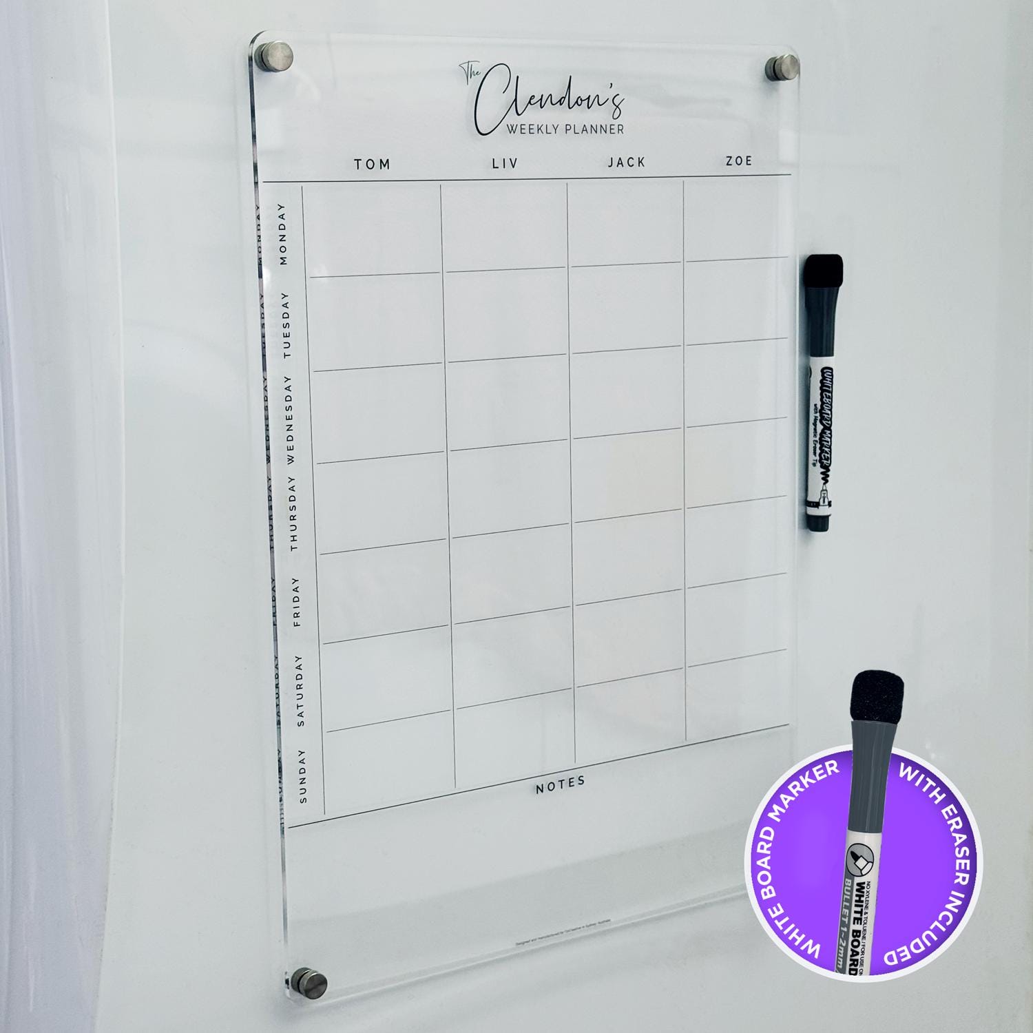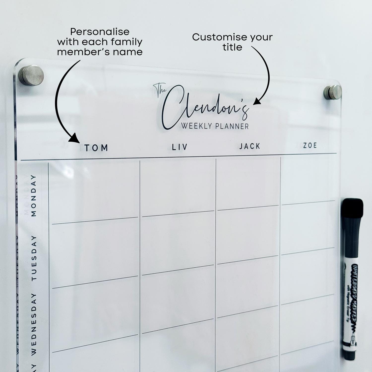 Clear weekly family acrylic fridge planner in portrait orientation, customised with your own title and family names. Comes assembled with magnetic stand-off hardware and with 1x black whiteboard marker included.