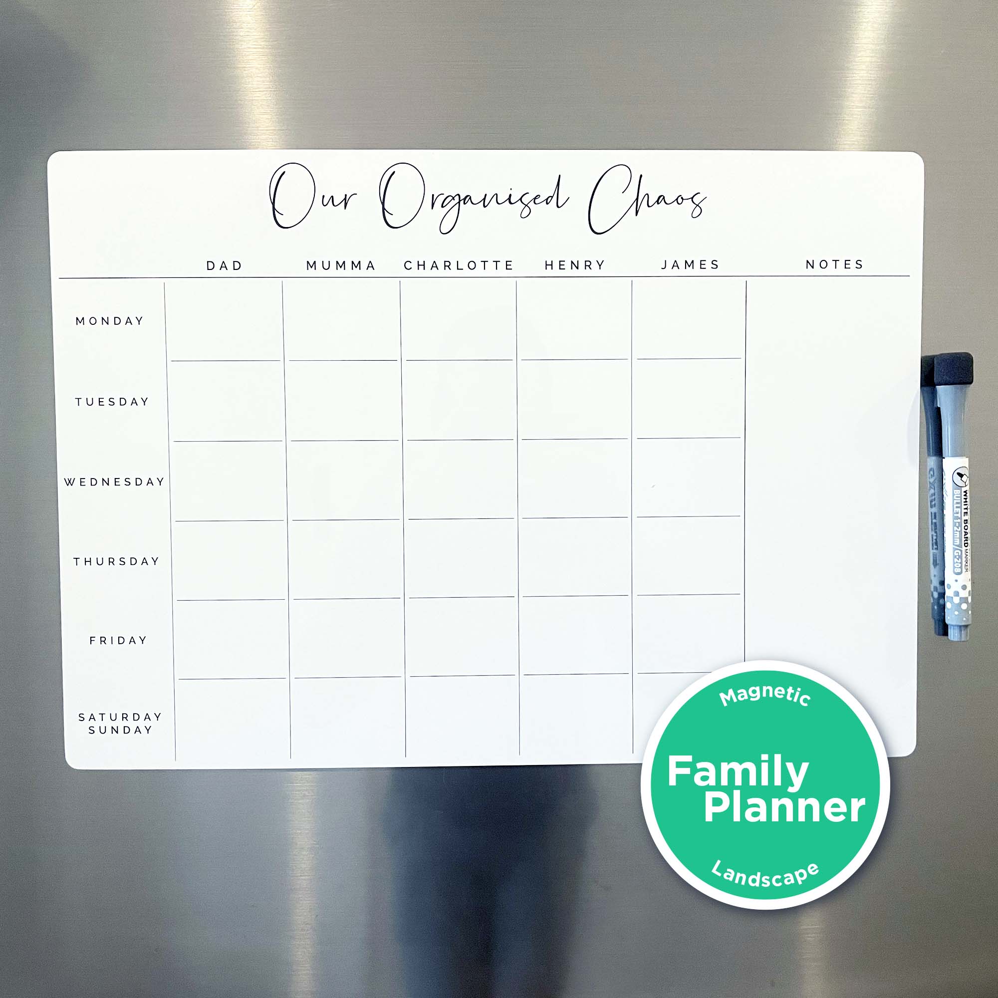 Customised magnetic family fridge planner. Personalised heading and column titles for each family member. Choose from 2 - 6 column names to suit your family. Black whiteboard marker included.