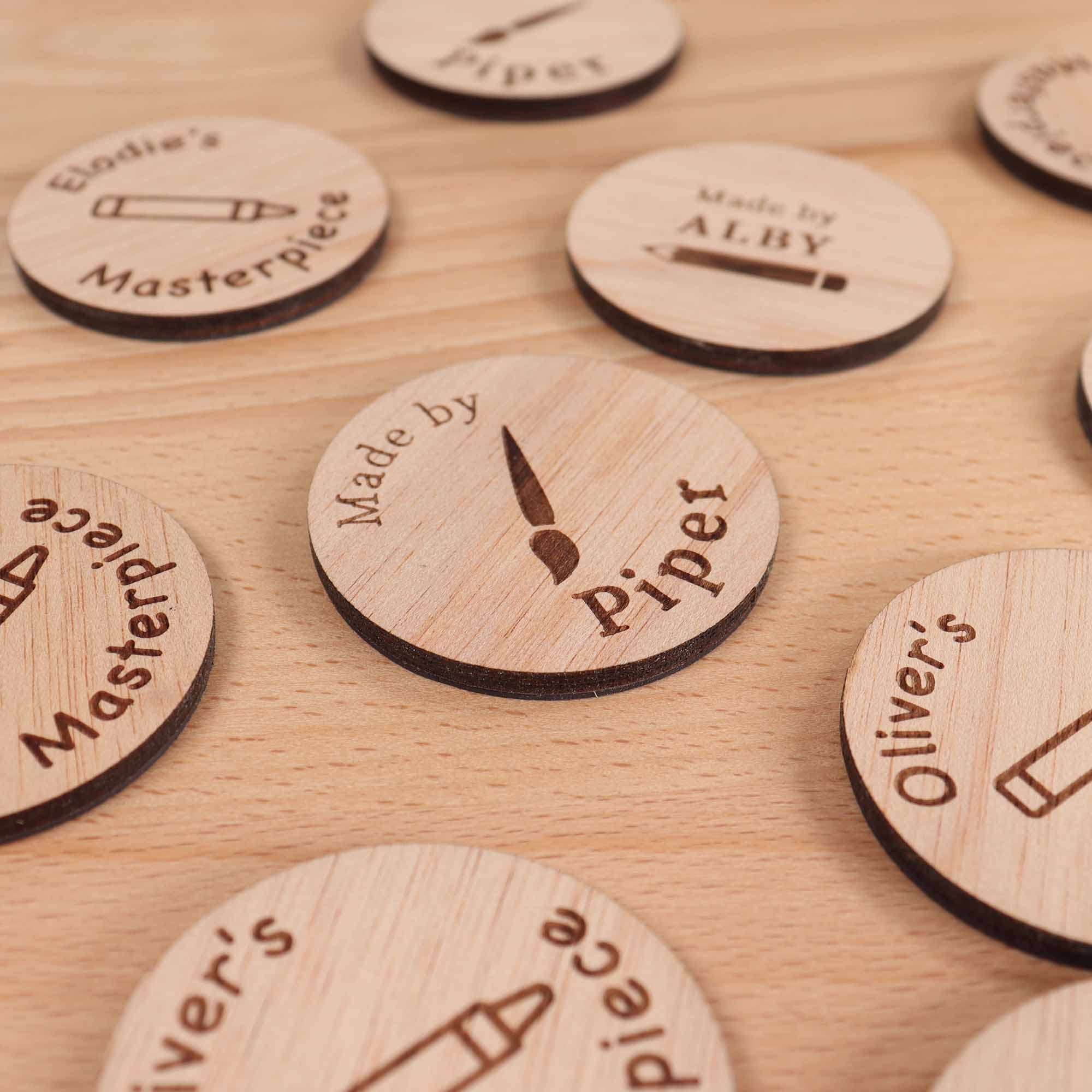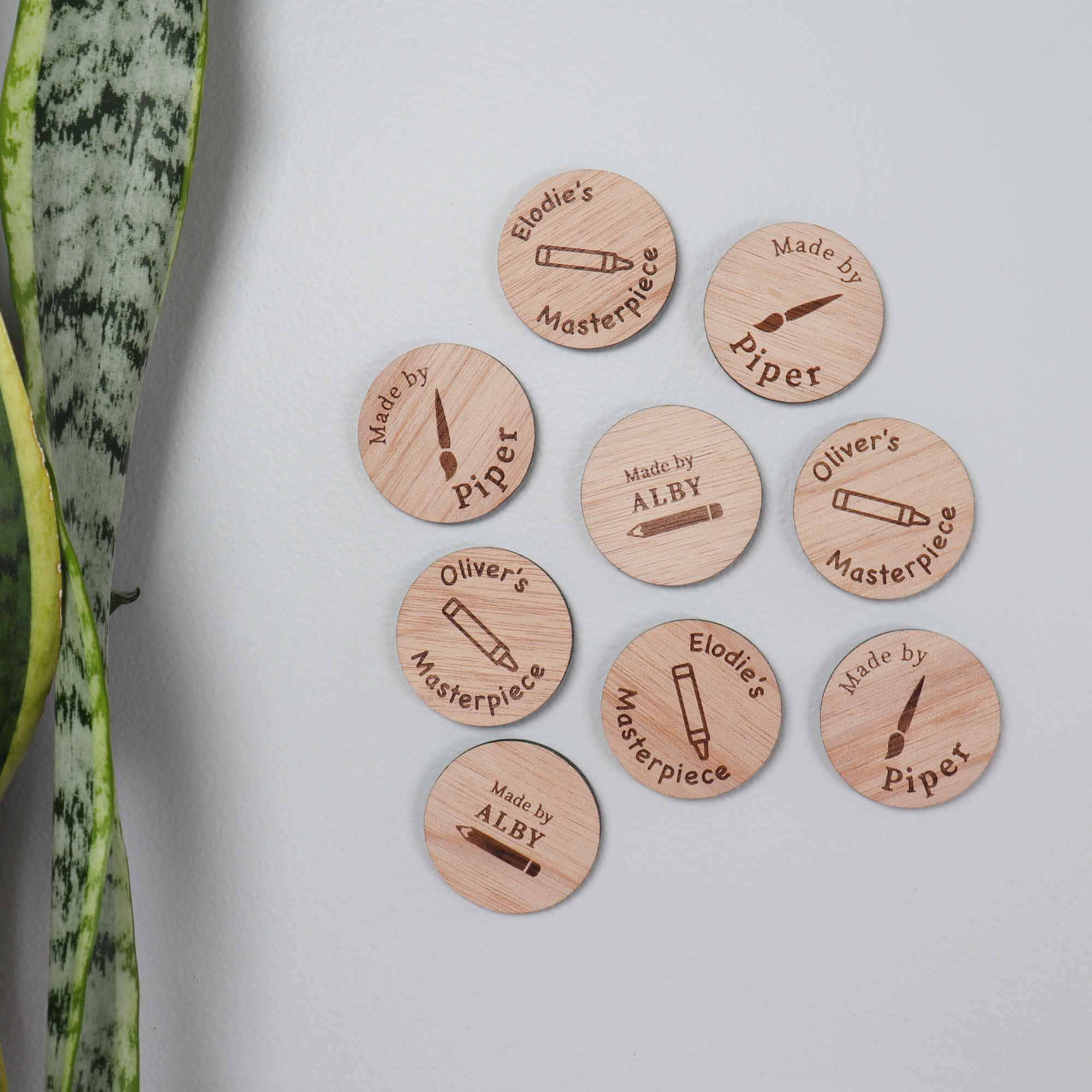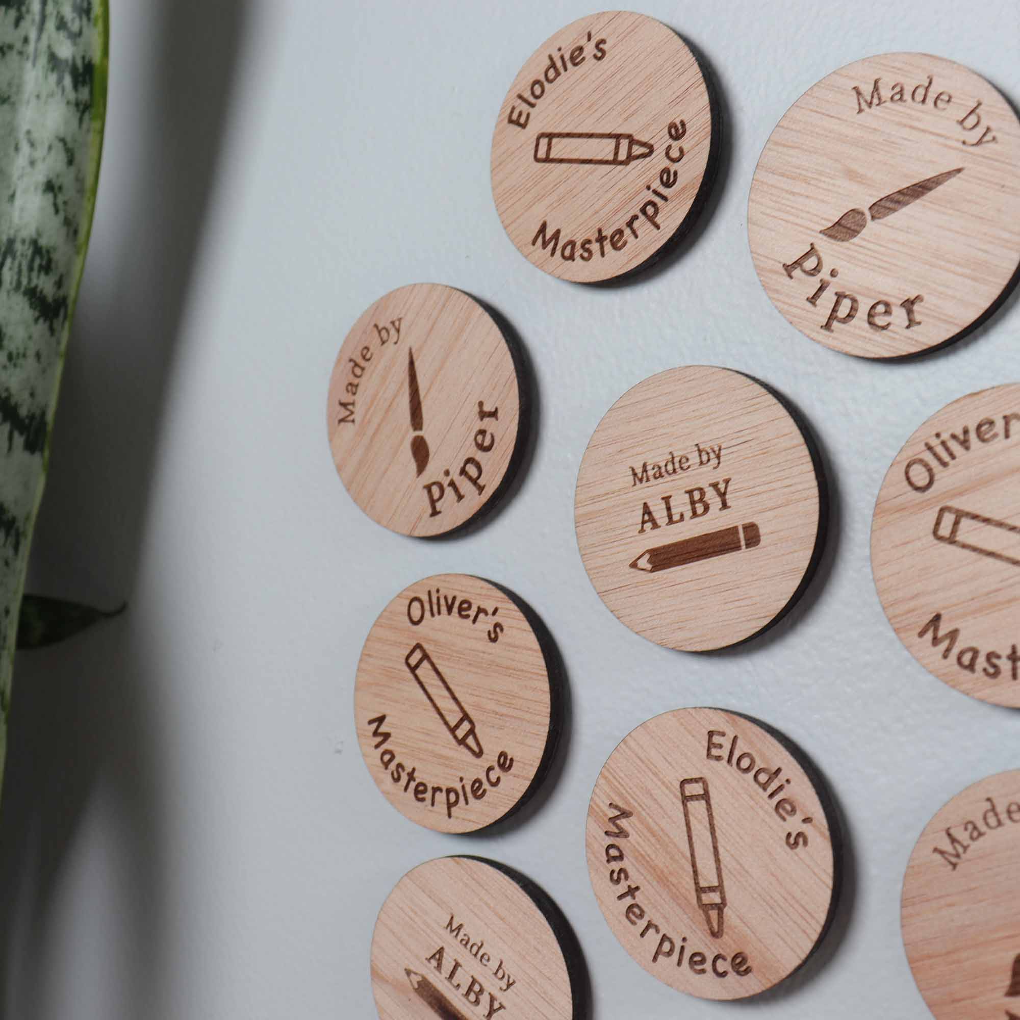Cut from premium wood with custom name and icon engraved. Attached to the back of each disc is a strong magnet.