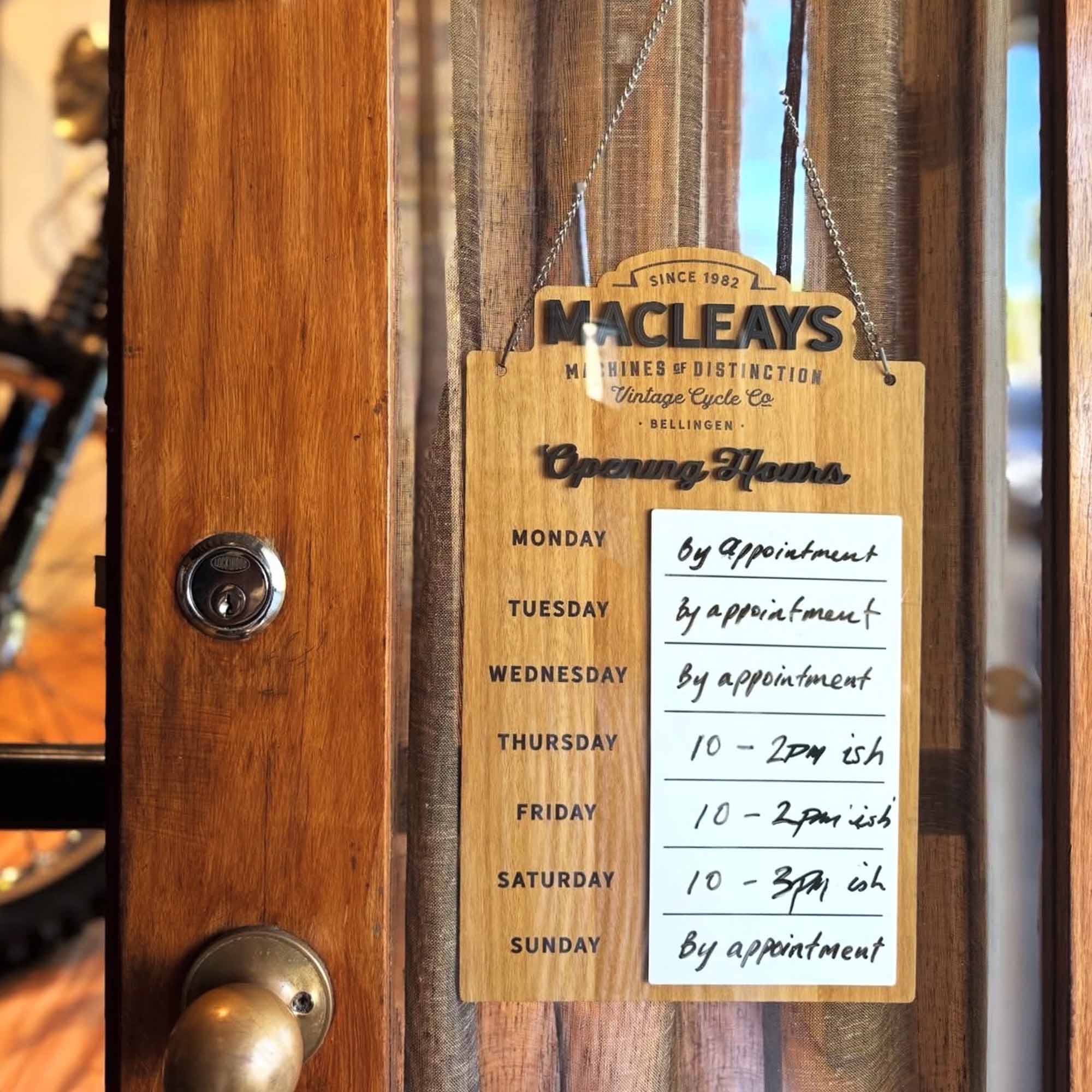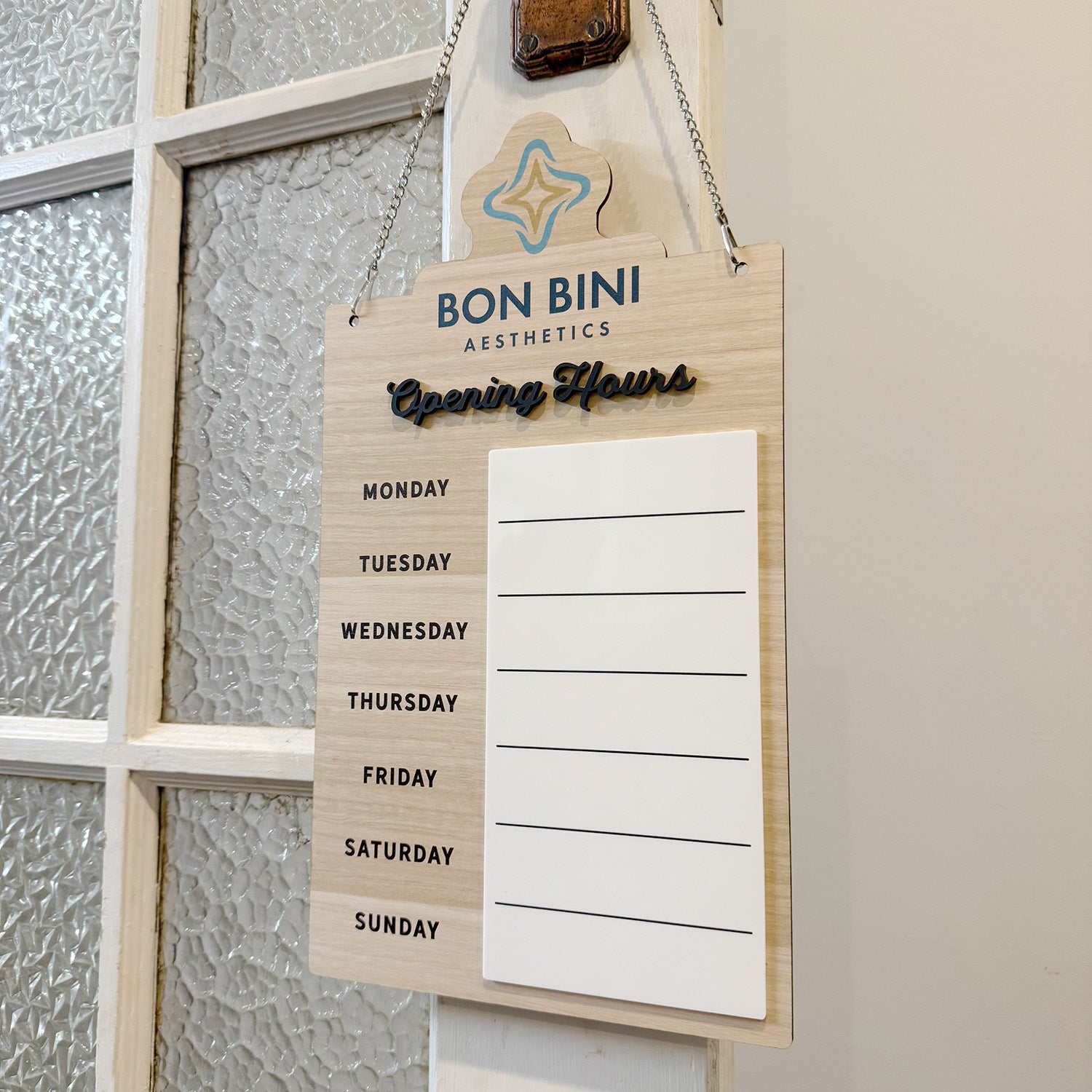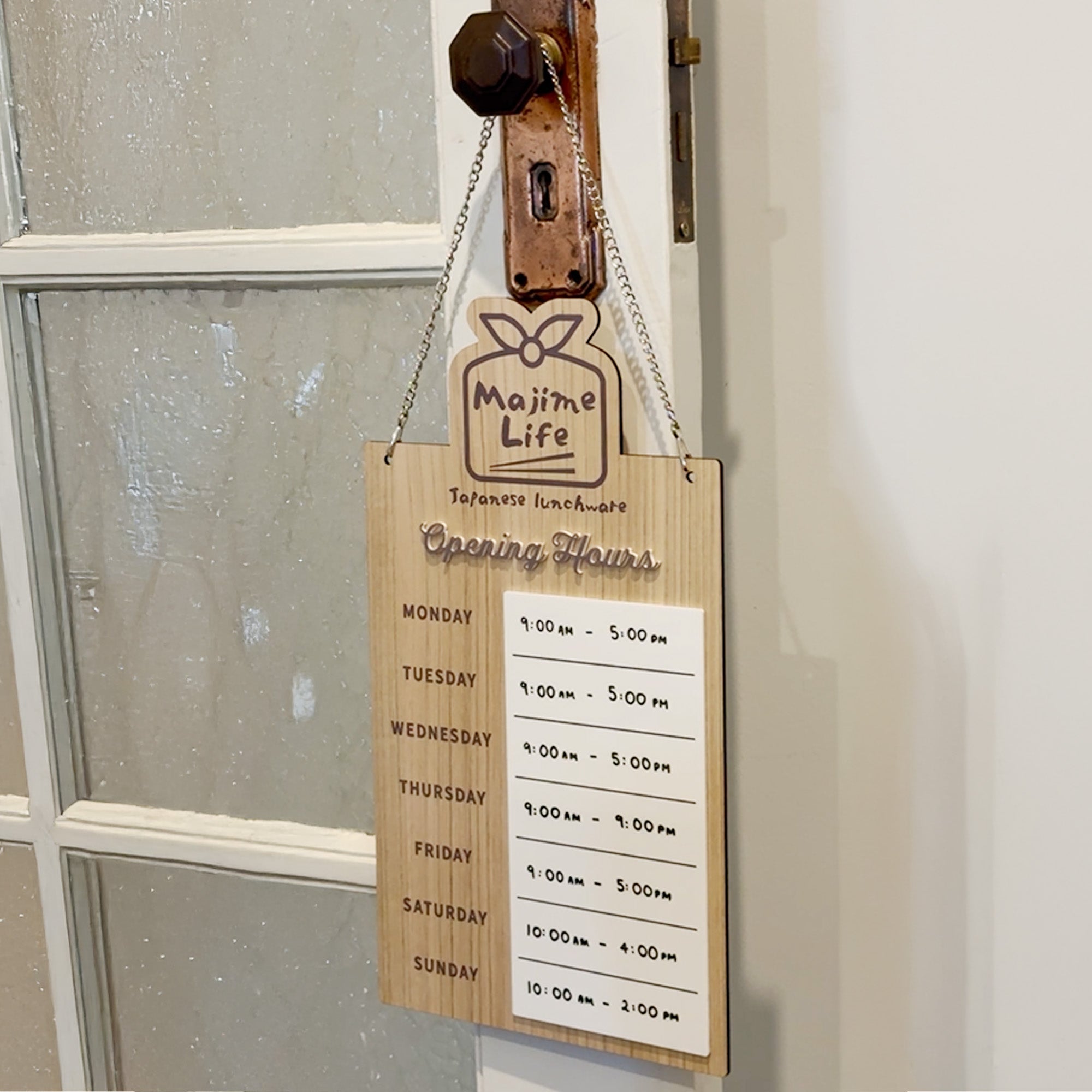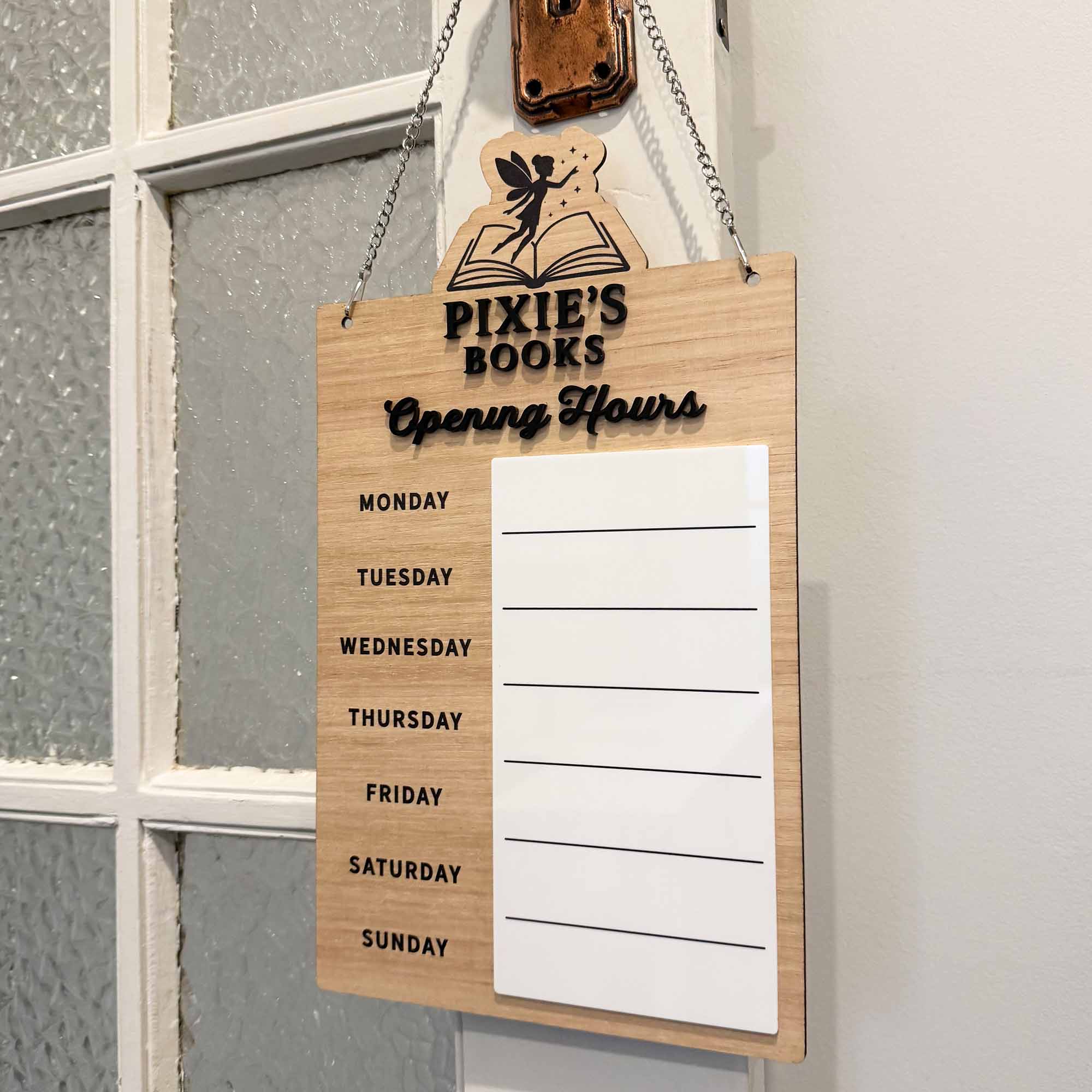 Premium, fully custom Opening Hours hanging door sign, perfect for easy updates on your shop's opening hours for each day of the week.